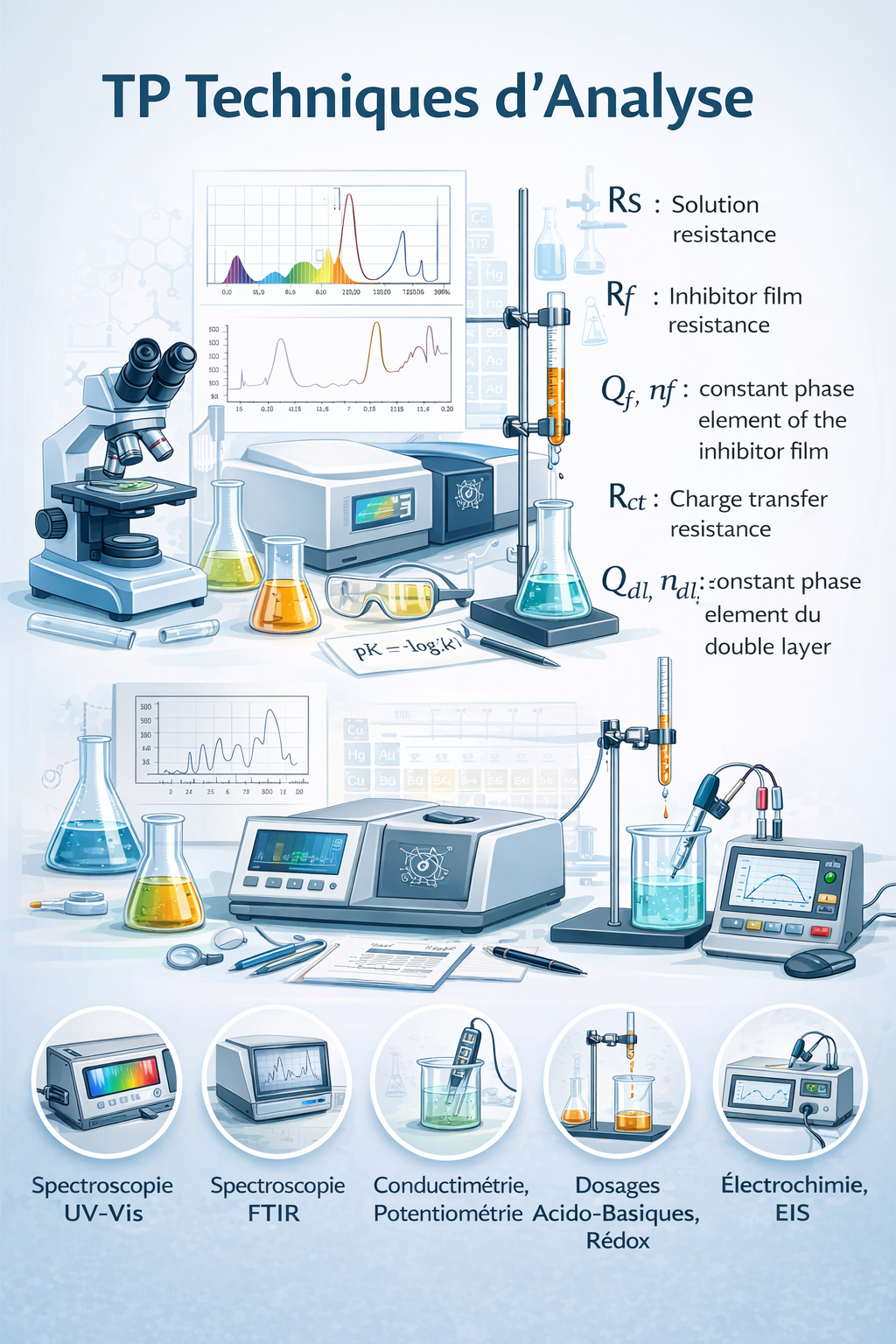 Le module TP technique d'analyse a pour objectif l'acquisition d'une maîtrise expérimentale des principales techniques d'analyse physico-chimique utilisées dans les laboratoires de recherche, de contrôle qualité et d'ingénierie des procédés. Il vise à développer les compétences pratiques liées à la préparation des échantillons, à l’utilisation des instruments d’analyse, à l’exploitation des résultats expérimentaux et à l’interprétation critique des données.